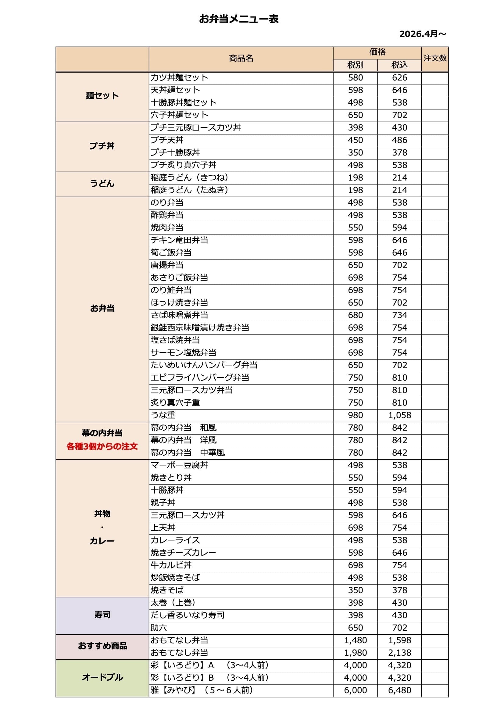 *また、幕の内弁当は各種3個からの注文となります。
